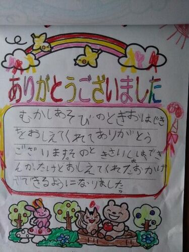 新年最初の見守り隊の会議に出席した。1年生担当の先生が会議室までいらして、昨年12月の「昔の遊びを楽しむ会」に対する、児童たちの綴ったお礼の手紙を下さった。 10人ほどの分をまとめて先生が表紙をつけ、他のまりつきやだるま落としなどの遊びを担…