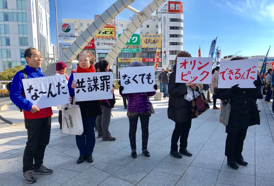 集会の輪の外側で、外に向かってプラカードを表示。そのあと、こうして掲げたままぞろぞろ並んで駅周辺を練り歩く。時々また止まってこの状態でプラカの表示・・・を集会&パレードの1時間行った。一人で一枚のプラカードを掲げるのと違って、字が大きくて読みやすいせいか、結構通りながら読んでいる方が多かった。